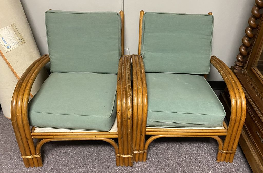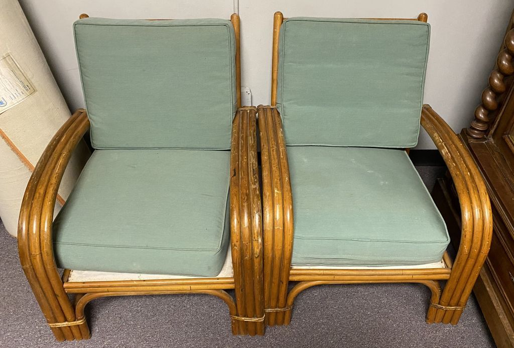 Pair of Bamboo Arm Chairs, with cushion, light wear. Location Back Pair of Bamboo Arm Chairs, with cushion, light wear. Location Back