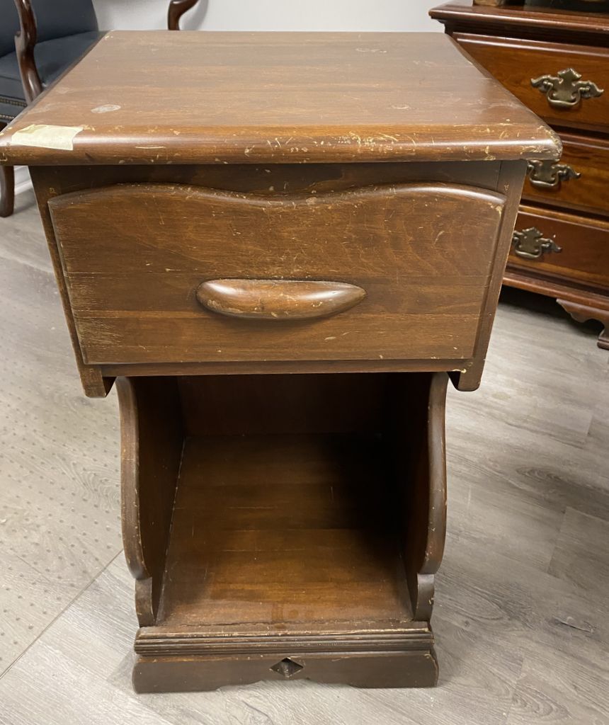 Mid 20th Century Bed Side Table, single drawer, open front storage, has scratches on finish. location Middle Right Office Mid 20th Century Bed Side Table, single drawer, open front storage, has scratches on finish. location Middle Right Office