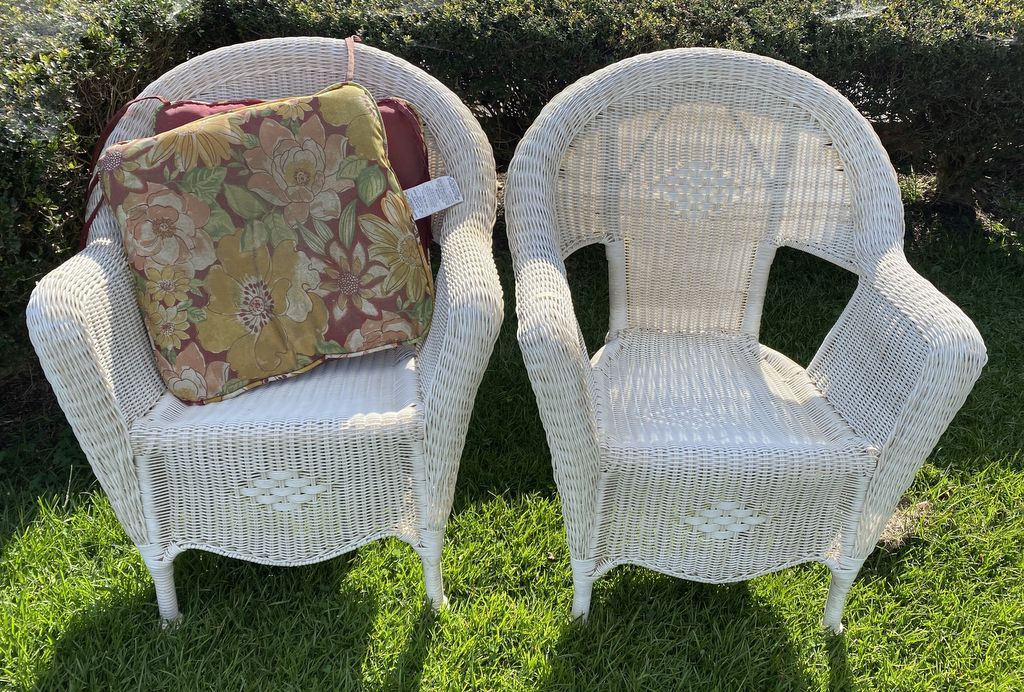 Pair of White Wicker Patio Chairs, light wear. Pair of White Wicker Patio Chairs, light wear.