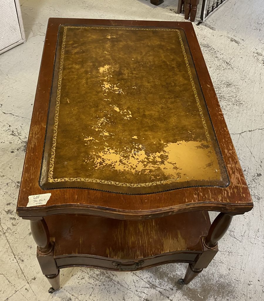 Worn Mahogany Lamp Table, Two tier, leather top, worn, single drawer, on casters, 23"h., 28"w., 19"d. Worn Mahogany Lamp Table, Two tier, leather top, worn, single drawer, on casters, 23"h., 28"w., 19"d.