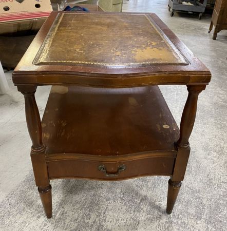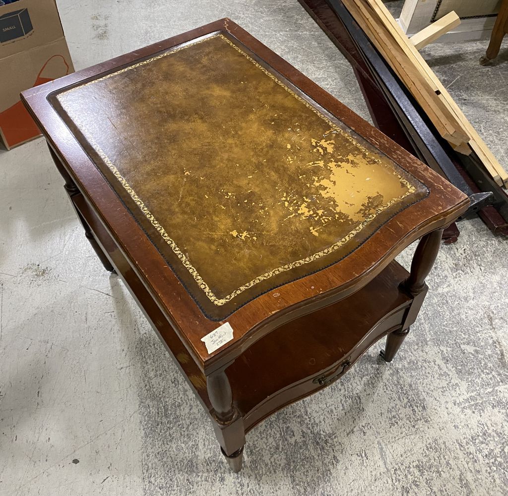 Worn Mahogany Lamp Table, Two tier, leather top, worn, single drawer, on casters. missing one, 23"h., 28"w., 19"d. Worn Mahogany Lamp Table, Two tier, leather top, worn, single drawer, on casters. missing one, 23"h., 28"w., 19"d.