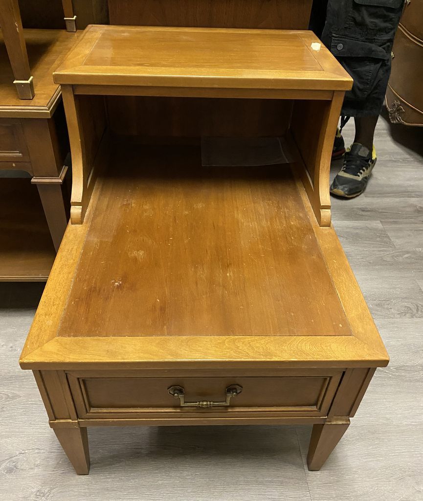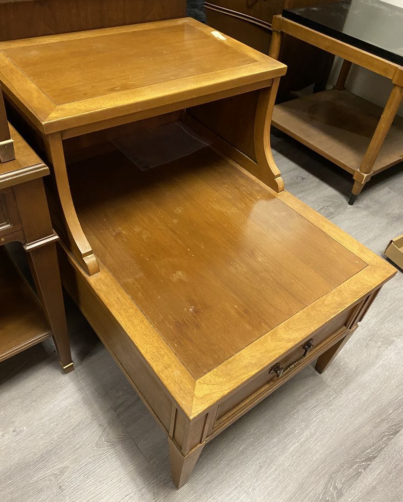 French Provincial Maple Step Up Table, single drawer, light wood wear. 25" h., 20" w., 28" d. French Provincial Maple Step Up Table, single drawer, light wood wear. 25" h., 20" w., 28" d.
