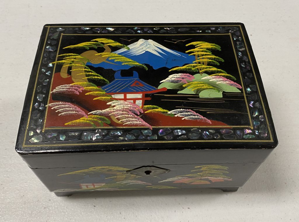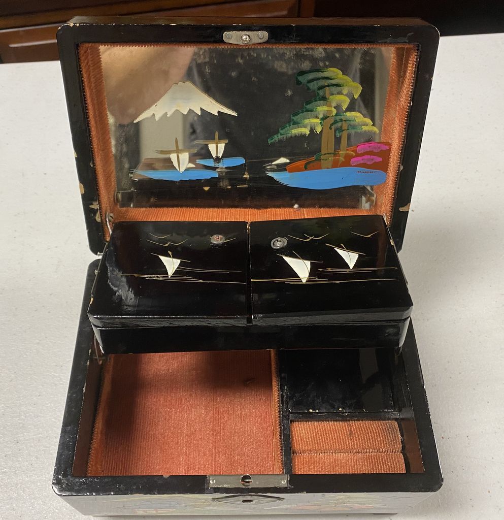 Black lacquer Chinese Jewelry Box, felt lining, hand painted. Black lacquer Chinese Jewelry Box, felt lining, hand painted.