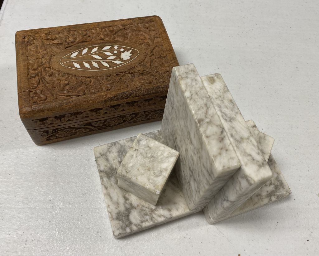 Carved Wood Trinket Box and Marble Bookends Carved Wood Trinket Box and Marble Bookends
