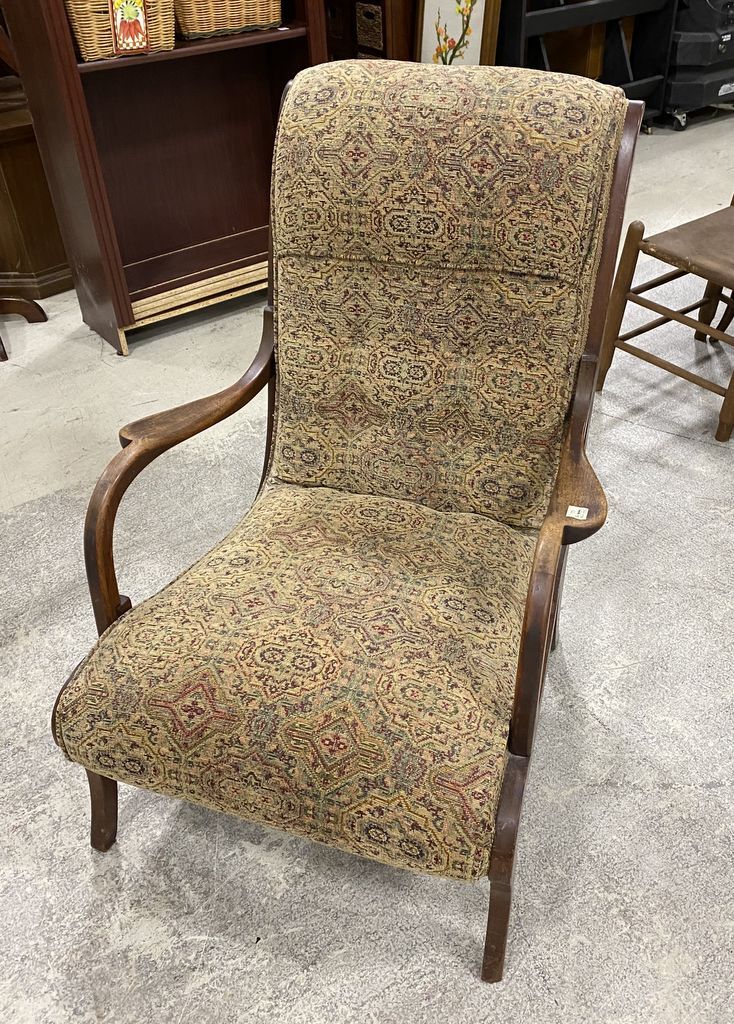 Old Mahogany Arm Chair, upholstered fabric, finish is worn. Old Mahogany Arm Chair, upholstered fabric, finish is worn.