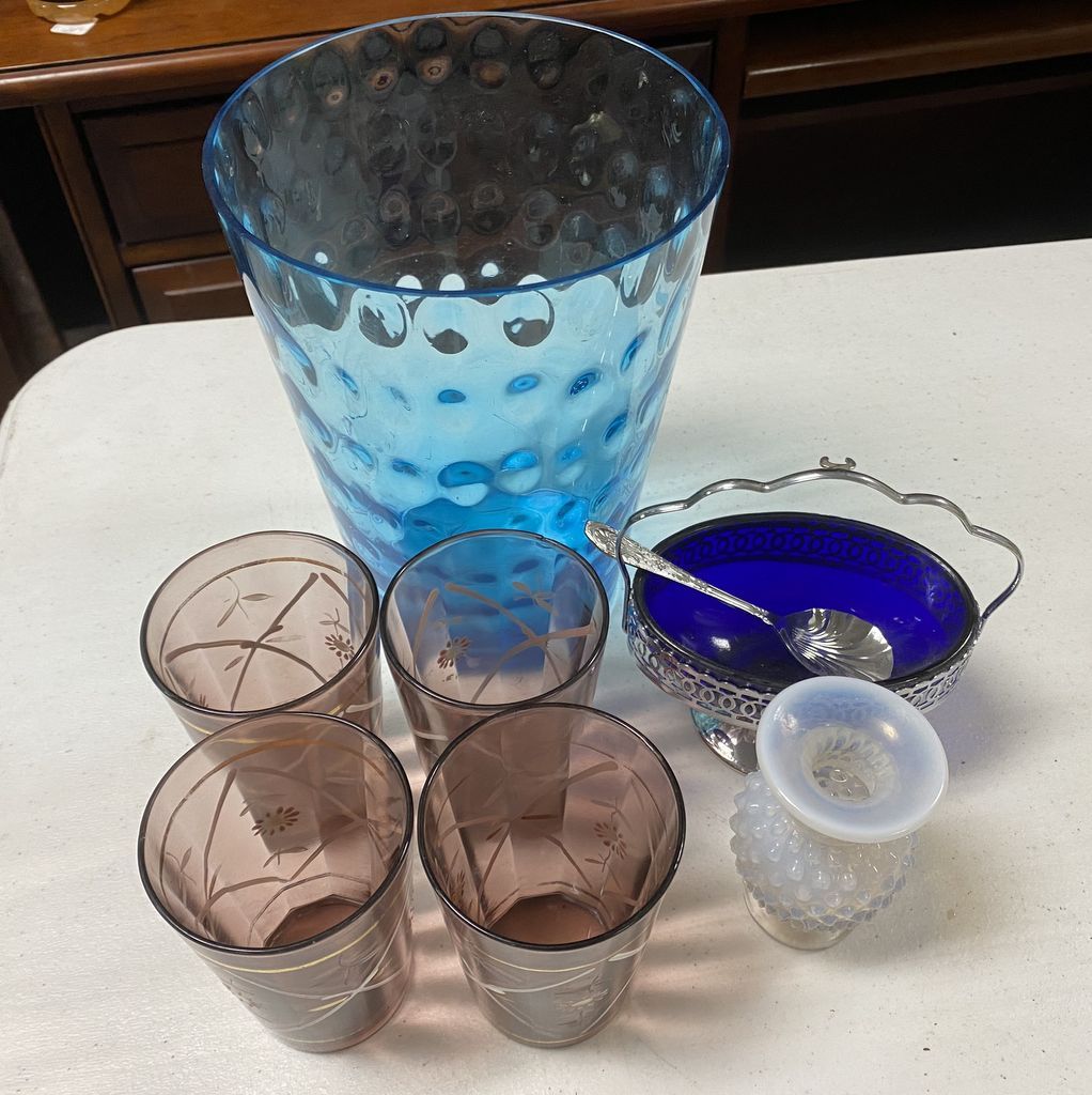 736 Bohemian Cups, Blue Vase, Fenton Vase, and Cobalt Blue Mustard