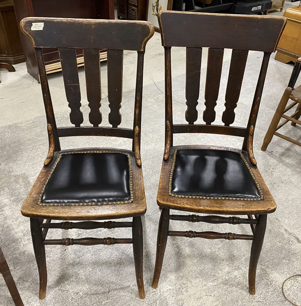 Pair of Old Spindle Side Chairs, leather cushions, worn finish. Pair of Old Spindle Side Chairs, leather cushions, worn finish.
