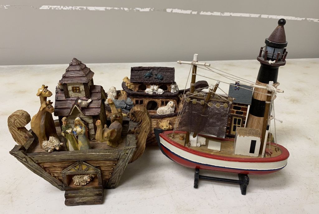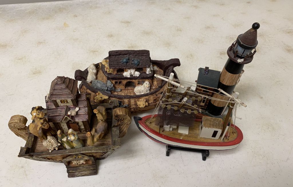 Collections Resin Figurines, Noah's Ark, Nativity scene, ship and lighthouse, tallest 8 1/2"h. Collections Resin Figurines, Noah's Ark, Nativity scene, ship and lighthouse, tallest 8 1/2"h.
