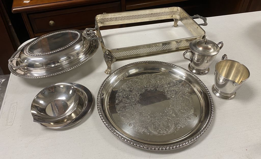 Silver Plate Serving Pieces, vegetable dish, round tray, cups, casserole stand. Silver Plate Serving Pieces, vegetable dish, round tray, cups, casserole stand.
