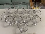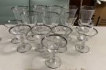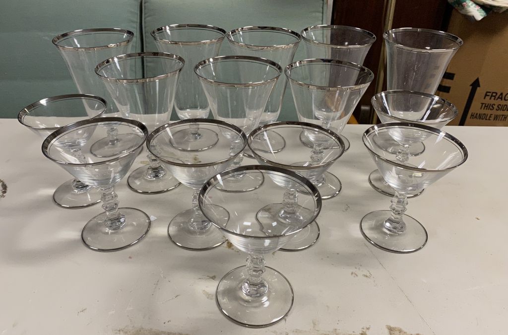 Silver rimmed stemware, goblets and martini glasses, one has chip. Silver rimmed stemware, goblets and martini glasses, one has chip.