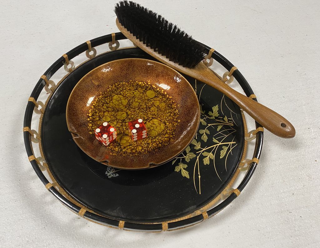 Asian Black Lacquer Plate, Enamel Bowl, and Brush Asian Black Lacquer Plate, Enamel Bowl, and Brush