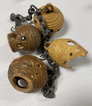 Four Piece Pottery Hanging Chime, one damaged. Four Piece Pottery Hanging Chime, one damaged.