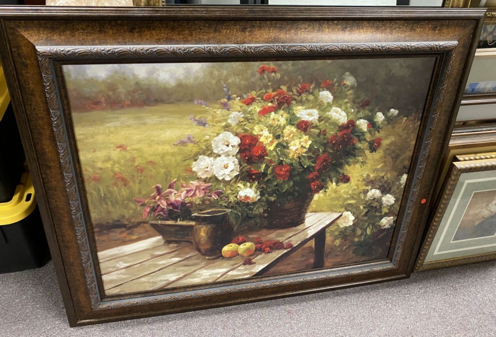 Large Giclee Flower Basket Print, on canvas, framed. Large Giclee Flower Basket Print, on canvas, framed.