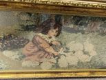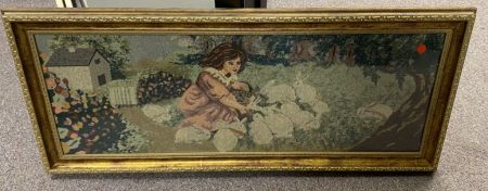 Framed Cross Stitch Style Lady wit Rabbits, glassed, framed. Framed Cross Stitch Style Lady wit Rabbits, glassed, framed.