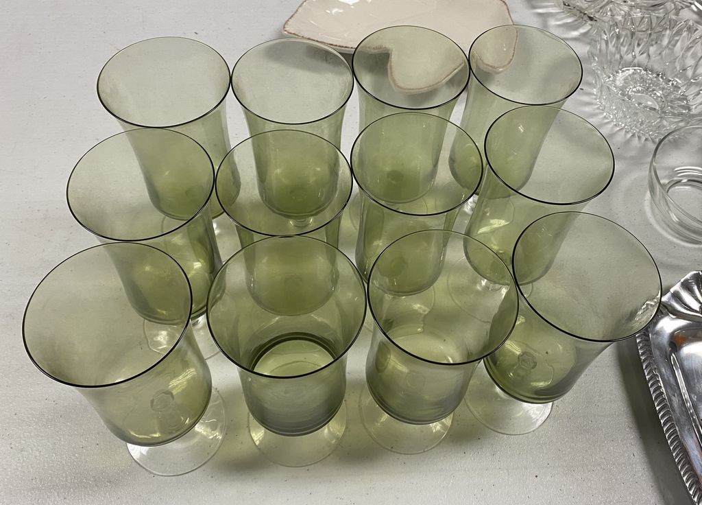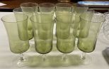 12 Green Glass Stemware, vintage, one may have rim chip. 12 Green Glass Stemware, vintage, one may have rim chip.