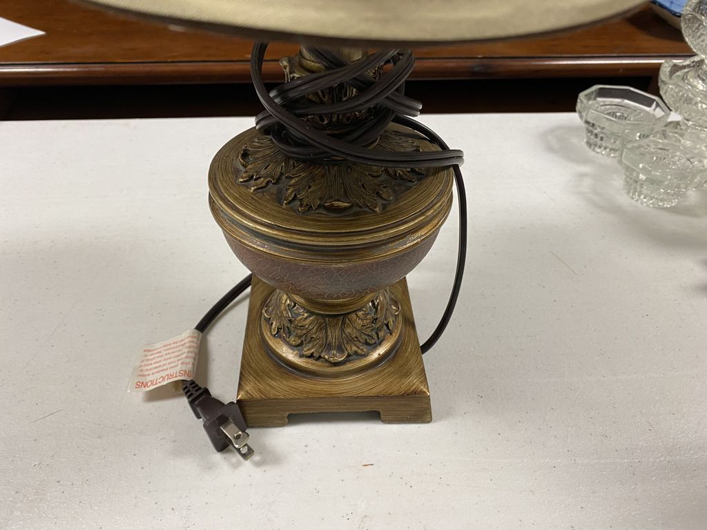 Small Resin urn table lamp, footed, nice shade. Small Resin urn table lamp, footed, nice shade.