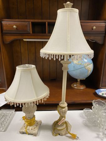 White Distressed Style Candle Stick and Urn Lamps, matching shades. White Distressed Style Candle Stick and Urn Lamps, matching shades.
