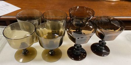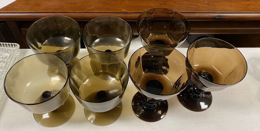 7 Green Glass Sherbets, Four matching, three matching. 7 Green Glass Sherbets, Four matching, three matching.