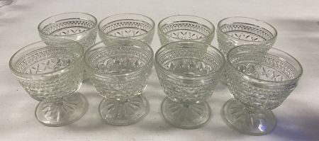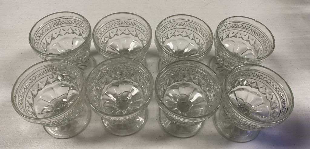 Eight Depression Glass Style Cups, several with rim chips. Eight Depression Glass Style Cups, several with rim chips.