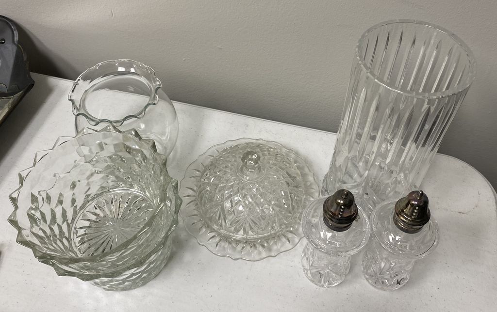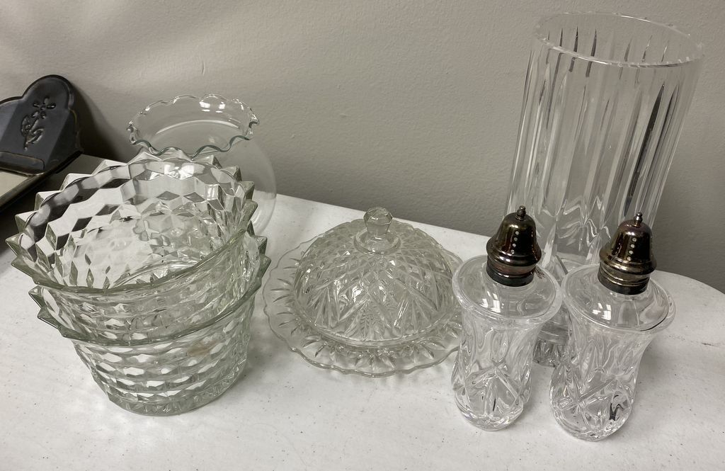 Cheese Dish, Salt & Pepper, Vases, and Fostoria Bowls Cheese Dish, Salt & Pepper, Vases, and Fostoria Bowls
