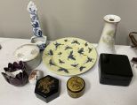 1004 Grouping of Assorted Items Includes Plate, Vases, Boxes, and Other Items