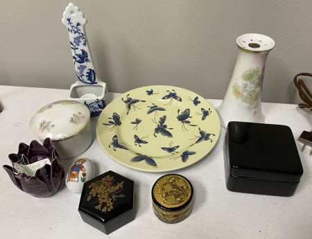 Grouping of Assorted Items Includes Plate, Vases, Boxes, and Other Items. Includes Hand Painted Butterfly Decorative Plate, Antique Porcelain Hatpin Holder Vase, Wall Hanger Porcelain Holder, Covered Jar, Small Vase, Egg, Oriental Black Lacquer Floral Trinket Box, Decorative Trinket Box, and Other Misc Items Grouping of Assorted Items Includes Plate, Vases, Boxes, and Other Items. Includes Hand Painted Butterfly Decorative Plate, Antique Porcelain Hatpin Holder Vase, Wall Hanger Porcelain Holder, Covered Jar, Small Vase, Egg, Oriental Black Lacquer Floral Trinket Box, Decorative Trinket Box, and Other Misc Items