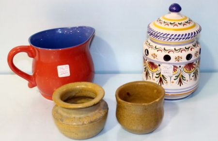 Red Pitcher, Puente Jar & Two Pottery Jars Red Pitcher, Puente Jar & Two Pottery Jars
