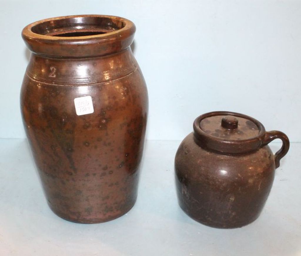 Butterchurn has no lid and no dasher 14" h.; Crock jar 7" dia. Butterchurn has no lid and no dasher 14" h.; Crock jar 7" dia.