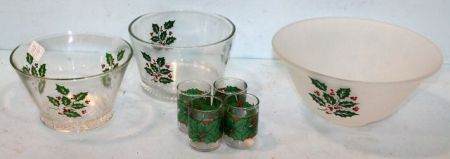 Satin glass bowl 10"; Two holly bowl 7"; Glasses 2" Satin glass bowl 10"; Two holly bowl 7"; Glasses 2"