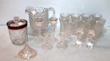 1123 Vintage Pitcher, Covered Jar, Eleven Glasses & Three Pair of Candlesticks