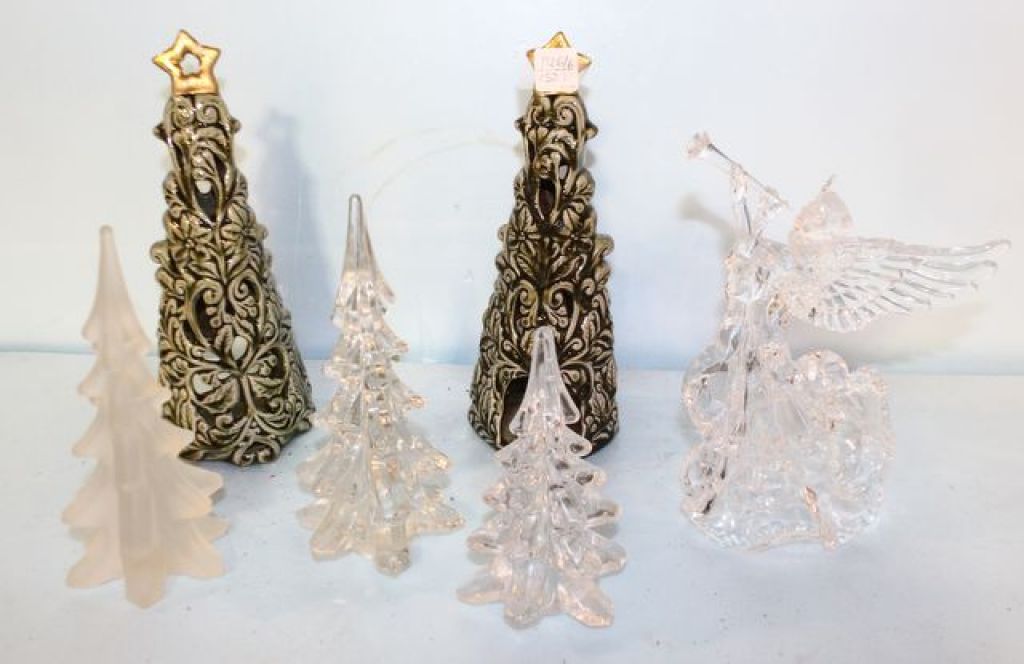 1126 Two Ceramic Christmas Tree Votives, Glass Trees & Angel