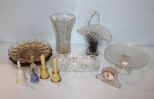 1135 Large Cut Glass Basket, Five Bells, Two Egg Trays, Cake Stand, Vase, Tray & Crystal Clock