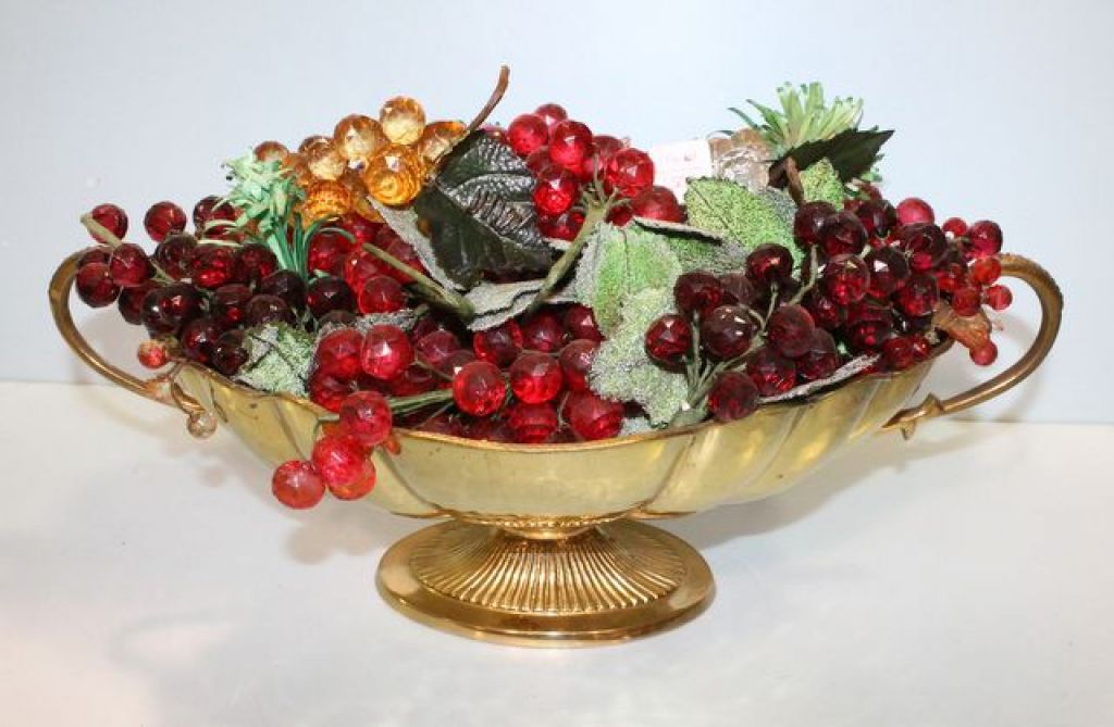 1146 Large Brass Centerpiece Full of Glass Fruit, Basket with Balls & Two Marble Balls on Stands