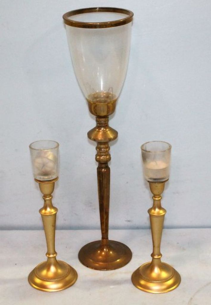 Brass Hurricane Lamp & Two Candlesticks Brass Hurricane Lamp & Two Candlesticks