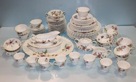 Nine dinner plates, eight salad plates, 17 saucers with eight boullions, eight regular cups, eight small cups, eight small saucers, eight bread/butter plates, sugar/creamer platter & vegetable bowl Nine dinner plates, eight salad plates, 17 saucers with eight boullions, eight regular cups, eight small cups, eight small saucers, eight bread/butter plates, sugar/creamer platter & vegetable bowl
