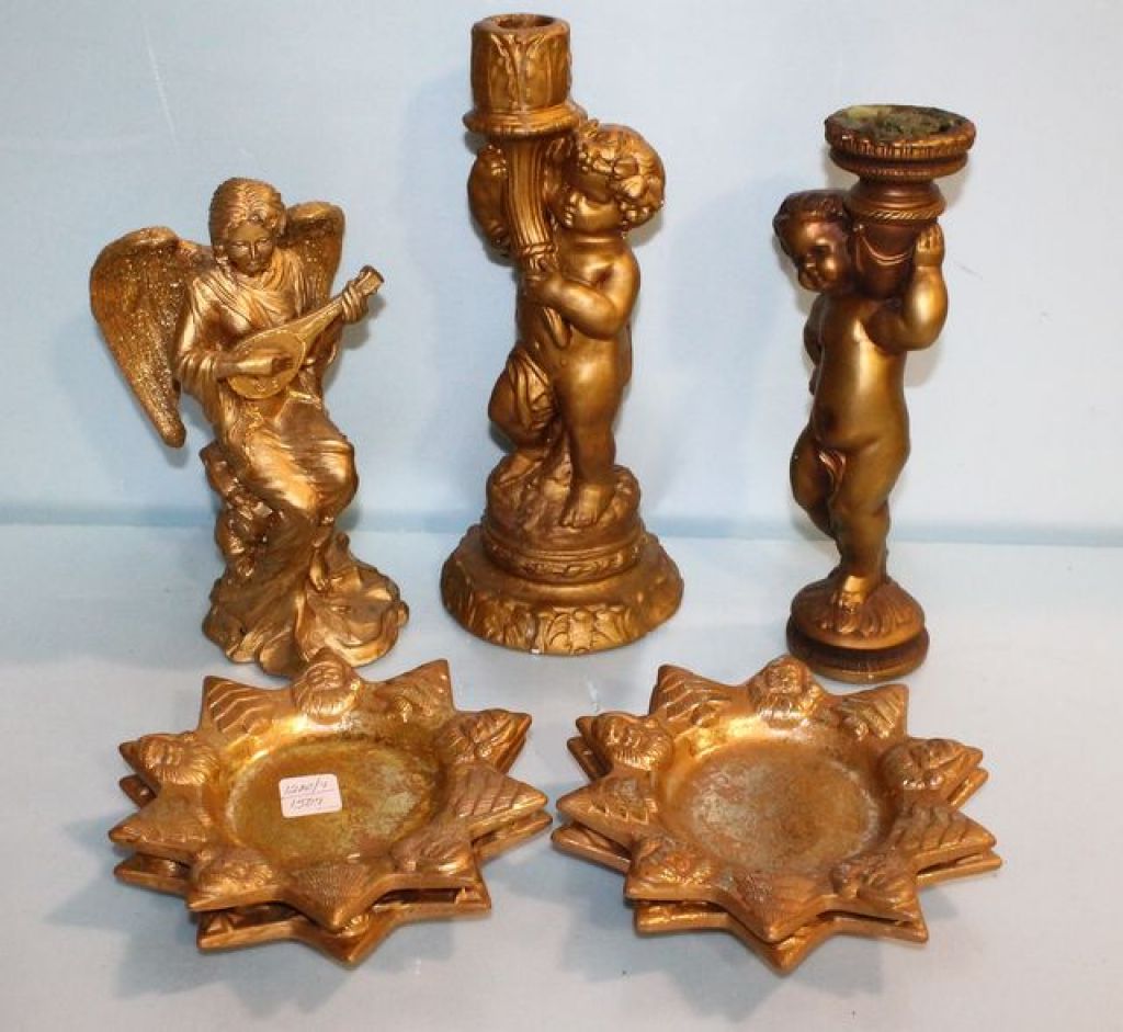 1200 Two Cupid Candlesticks, Angel Figurine & Four Coasters