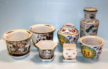 Three Porcelain Flower Pots, Two Porcelain Vases & Two Small Porcelain Pots Three Porcelain Flower Pots, Two Porcelain Vases & Two Small Porcelain Pots