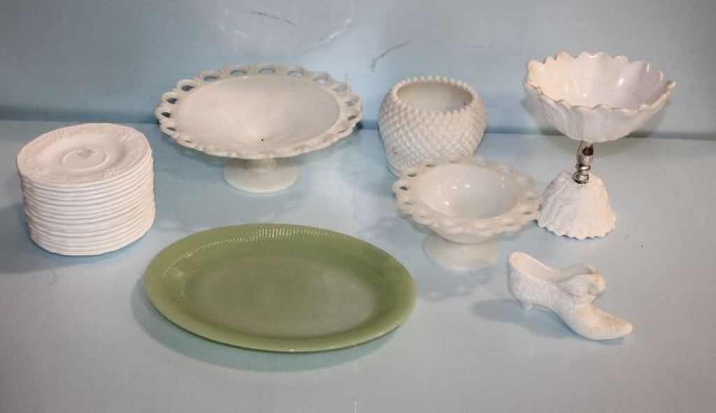 1270 Milk Glass Plates, Compote, Shoe & Vase