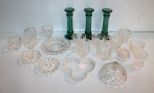 Eleven Punch Cups, Three Green Candlesticks & Glass Dishes Eleven Punch Cups, Three Green Candlesticks & Glass Dishes