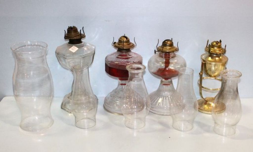Four Oil Lamps, Hurricane Shade & Four Chimneys Four Oil Lamps, Hurricane Shade & Four Chimneys