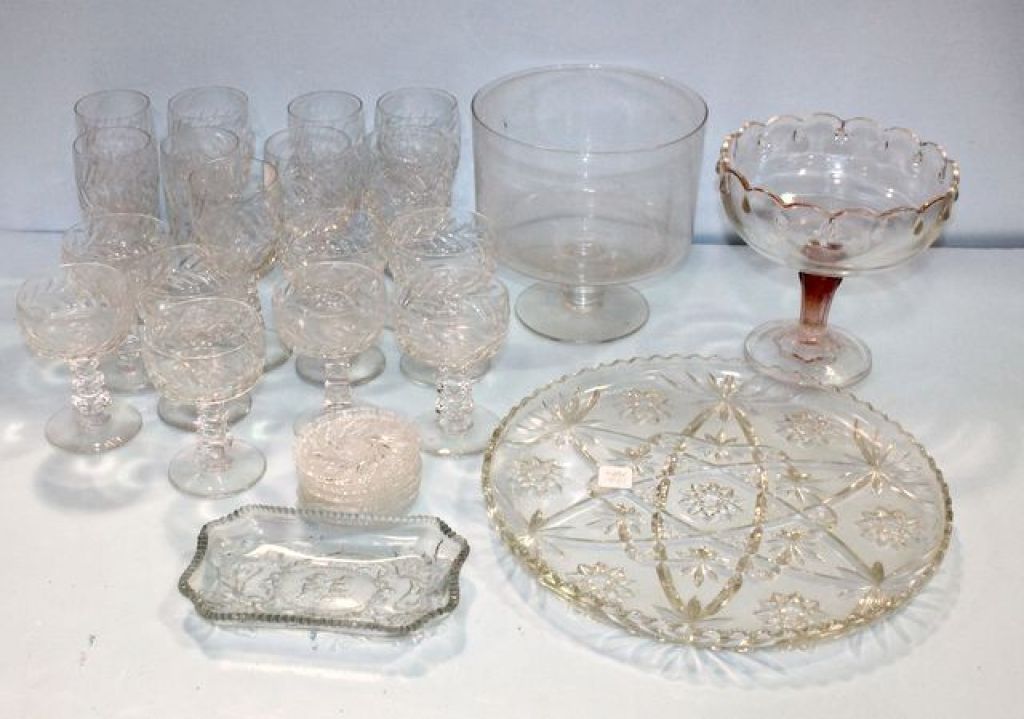 Eight Sherbet Glasses, Nine Water Glasses, Two Compotes, Large Tray & Six Coasters Eight Sherbet Glasses, Nine Water Glasses, Two Compotes, Large Tray & Six Coasters