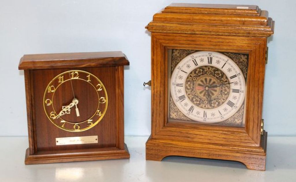 Mantel clock 11" w., 15" h.; Clock with plaque 10" w., 10" h. Mantel clock 11" w., 15" h.; Clock with plaque 10" w., 10" h.