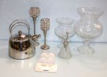1399 Two Glass Candleholders, Heart Mold, Two Decorative Goblets & Palm Restaurant Teapot