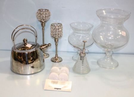 Two Glass Candleholders, Heart Mold, Two Decorative Goblets & Palm Restaurant Teapot Two Glass Candleholders, Heart Mold, Two Decorative Goblets & Palm Restaurant Teapot