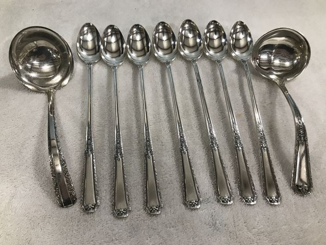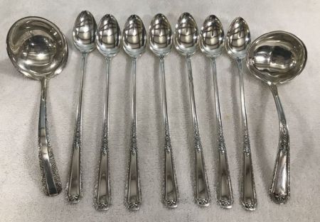 7 Sterling Tea Stir Spoons and 2 Sterling Ladles, one ladle is Towle sterling Candlelight ladle, 9.930 ozt. 7 Sterling Tea Stir Spoons and 2 Sterling Ladles, one ladle is Towle sterling Candlelight ladle, 9.930 ozt.