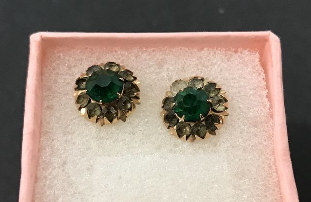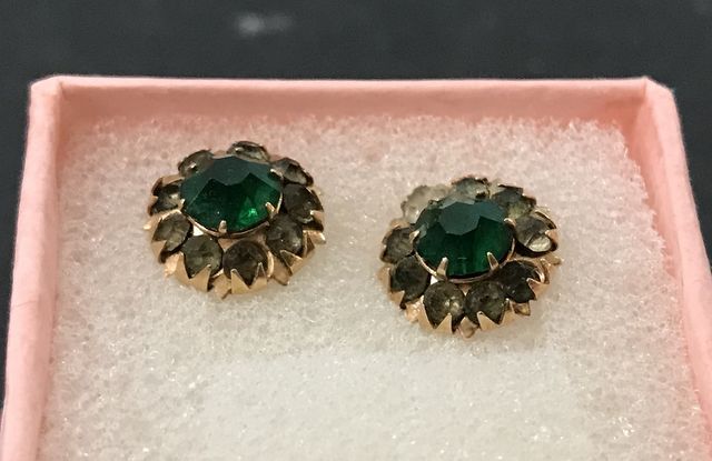 10K gold earrings, Emerald & possibly costume rhinestones, marked 10K. 10K gold earrings, Emerald & possibly costume rhinestones, marked 10K.