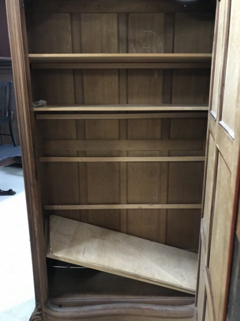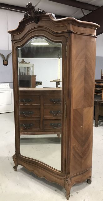Louis XV (early-mid 1900's) French Walnut Single Door Wardrobe, mirrored door, remove top with crest, inner shelves, two are set, other four need bracket clips, no key, good condition. 97"h., 42"w., 19"d. Louis XV (early-mid 1900's) French Walnut Single Door Wardrobe, mirrored door, remove top with crest, inner shelves, two are set, other four need bracket clips, no key, good condition. 97"h., 42"w., 19"d.