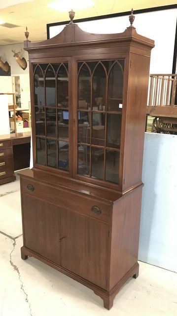 Williams Furniture Company Chippendale Style China Cabinet, finial crest, two wood shelves, glass doors, single base drawer, double door with storage shelf, Mahogany finish, light scratches, has key, 85"h., 39"w., 18"d. Williams Furniture Company Chippendale Style China Cabinet, finial crest, two wood shelves, glass doors, single base drawer, double door with storage shelf, Mahogany finish, light scratches, has key, 85"h., 39"w., 18"d.
