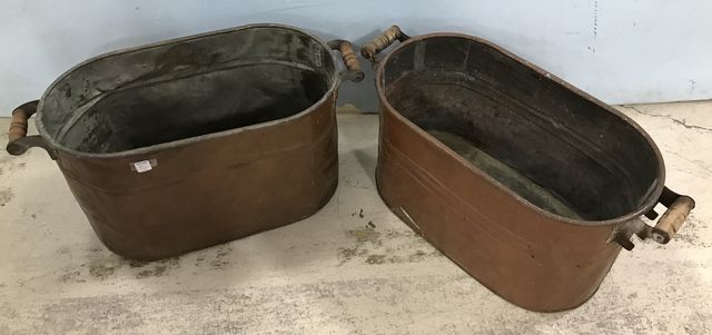 Two Vintage copper buckets, wood handles, age wear, with dents, 14"h., 23"w. Two Vintage copper buckets, wood handles, age wear, with dents, 14"h., 23"w.