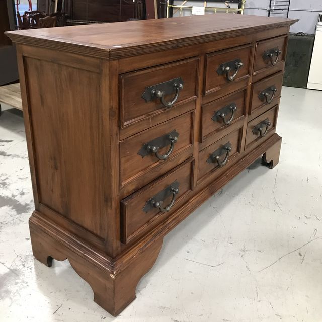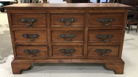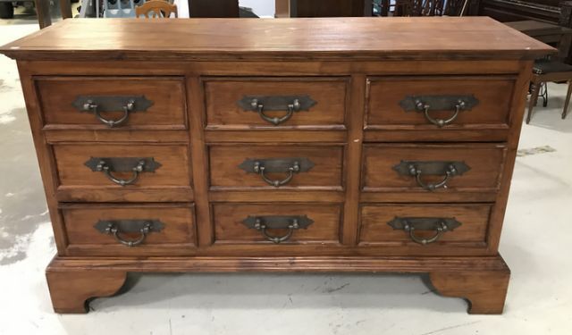 Large Indo Antique Reproduction Dresser, 9 drawers, Early American style, one drawer missing side trim piece, 49"h., 80"w., 25"d. Large Indo Antique Reproduction Dresser, 9 drawers, Early American style, one drawer missing side trim piece, 49"h., 80"w., 25"d.